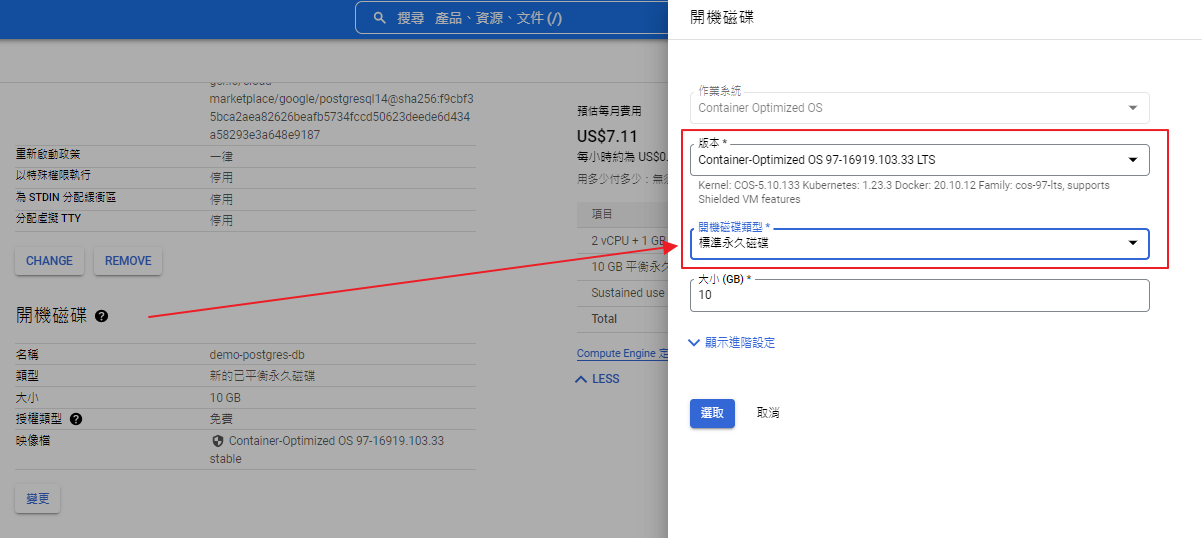 30 GB 以內的標準永久磁碟,但容器(CONTAINER)預設帶出來的是新的已平衡永久磁碟,要點開來更改 - 版本則照容器(CONTAINER)帶出來的,選一樣即可。以我的為例,即