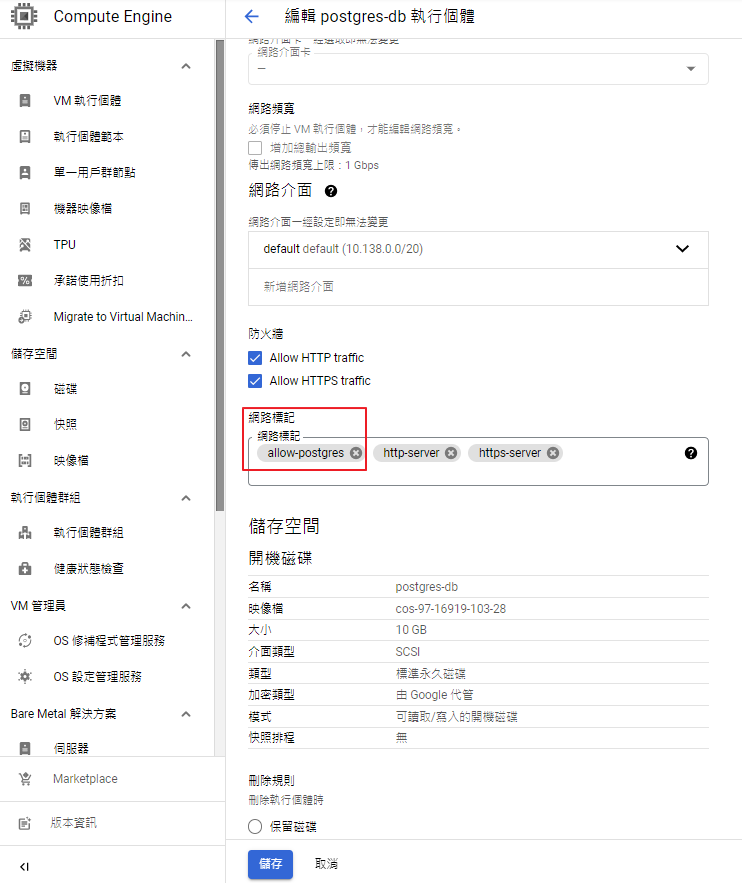 網路標記(Target tags)增加剛剛建立的allow-postgres - 按儲存